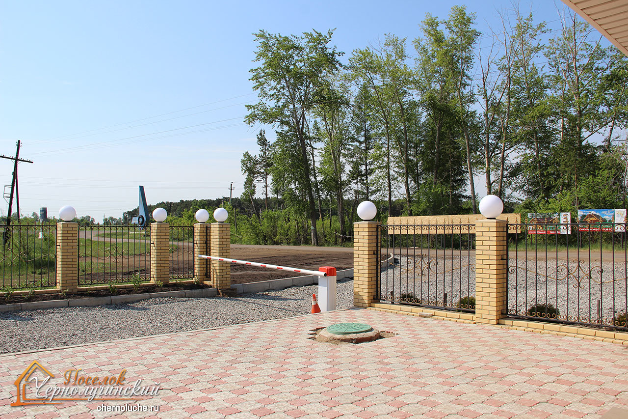Внешнее ограждение поселка, на въезде в поселок установлен автоматический шлагбаумом. Функционирует система видеонаблюдения.